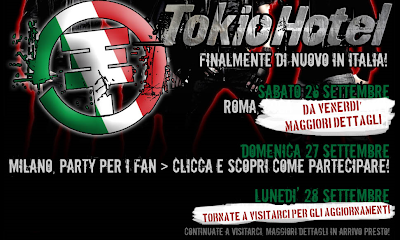 A Tokio Hotel szeptember 26.-n Rmban lesz. Korbbi hrek mr voltak arrl, hogy szeptember 26.,27. s 28.-n Olaszorszgba replnek. Pnteken tbb rszlet lesz, hogy mit is terveznek erre a napra!